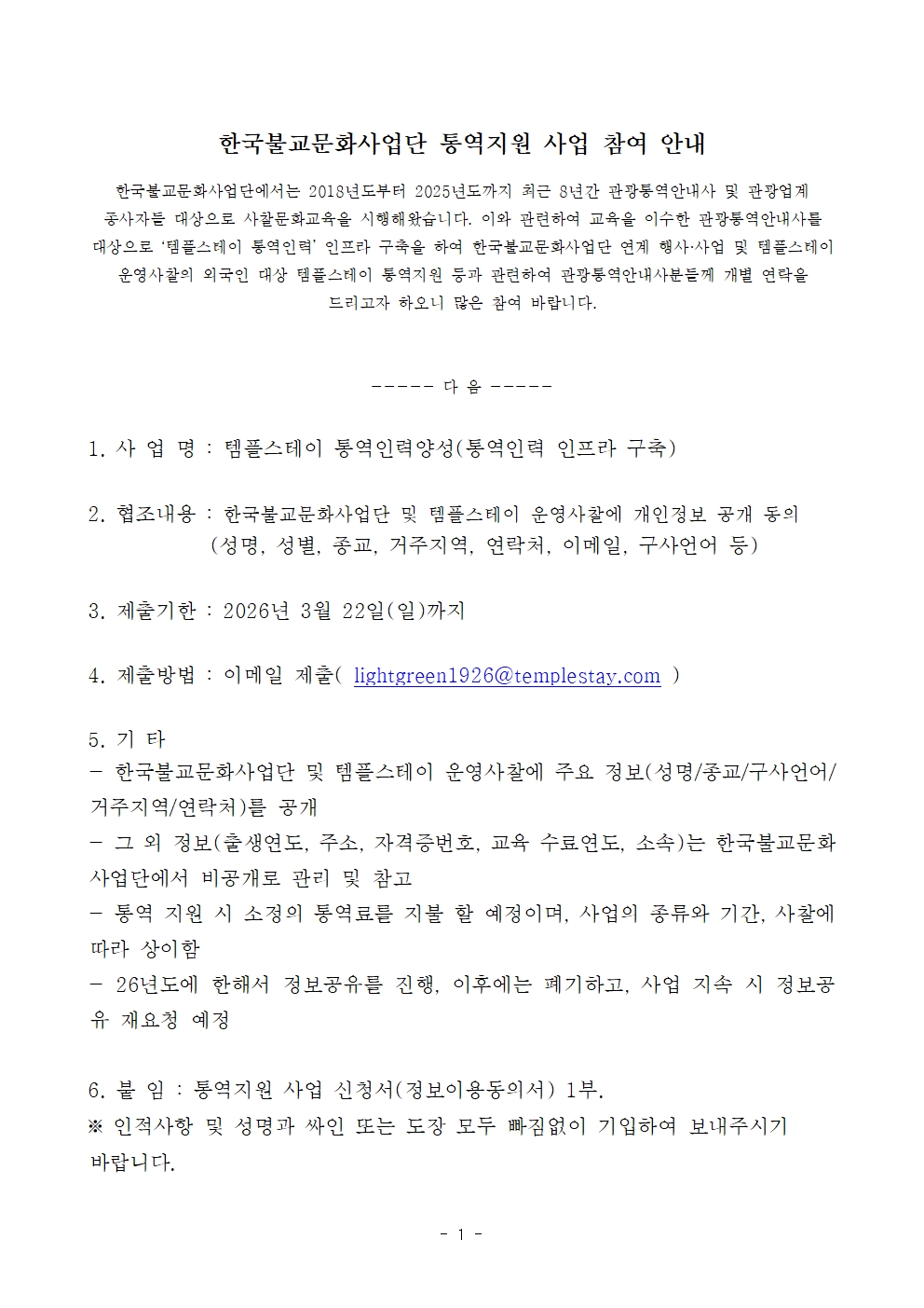 [한국불교문화사업단] 2026년 템플스테이 통역인력풀 모집 안내