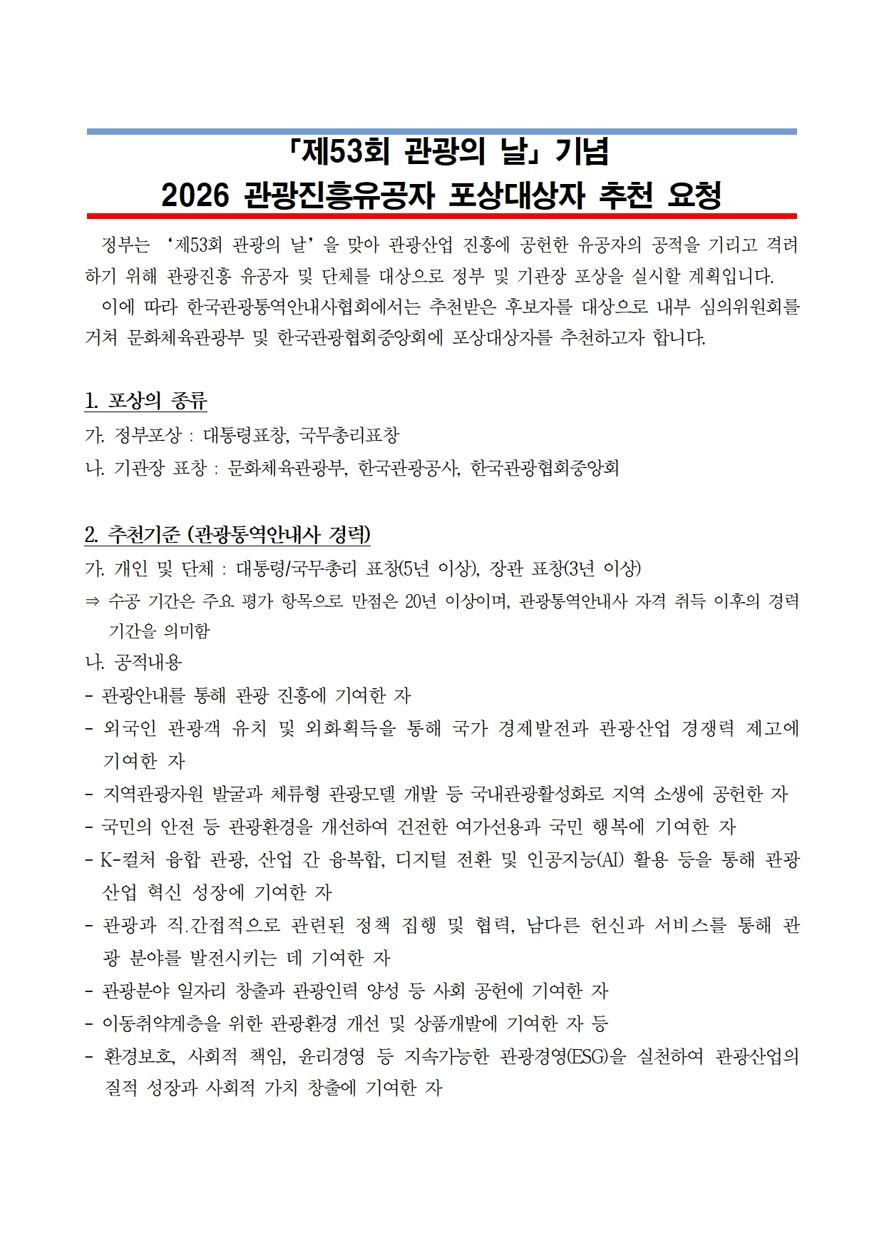 제53회 관광의 날 기념 관광진흥 유공 포상 추천 공고문
