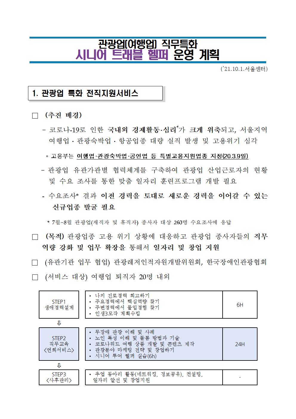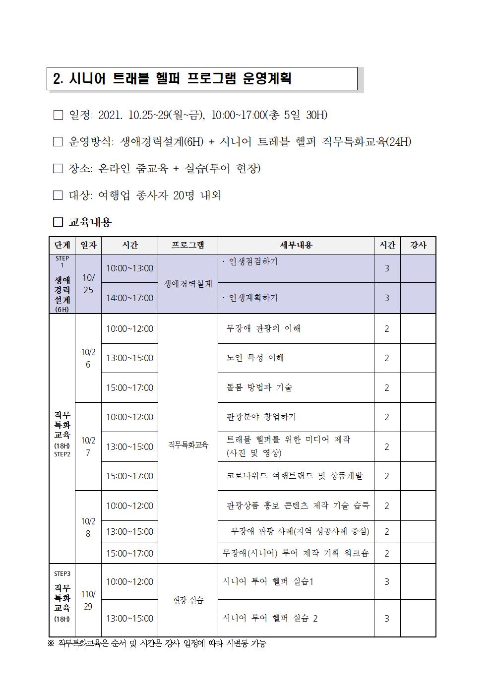 - 교육: 생애 경력 설계(6H) + 무장애 트래블 헬퍼 직무특화교육(24H)