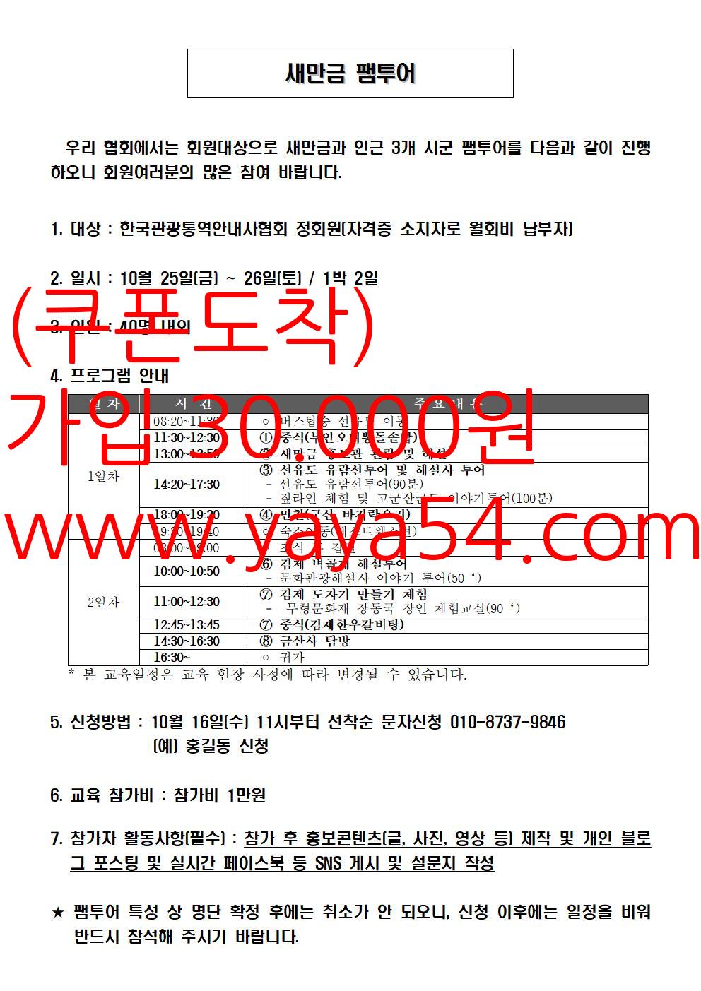 ★ 신청 방법 및 접수일시를 꼭 읽고 신청 바랍니다 ★★ 기한내 신청 및 문자 접수만 가능하며, 접수인원이 많을 경우 조기 마감 ★★ 신청자격 : 협회 가입 3개월 이상 및 현재 회비 미납이 없는 자 ★