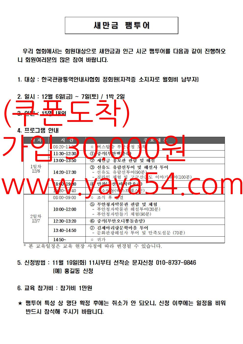 ★ 신청 방법 및 접수일시를 꼭 읽고 신청 바랍니다 ★★ 기한내 신청 및 문자 접수만 가능하며, 접수인원이 많을 경우 조기 마감 ★★ 신청자격 : 협회 가입 3개월 이상 및 현재 회비 미납이 없는 자 ★