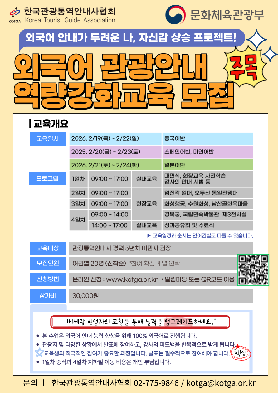 | 교육대상 | 해당언어 관광통역안내사 자격증 소지자 |