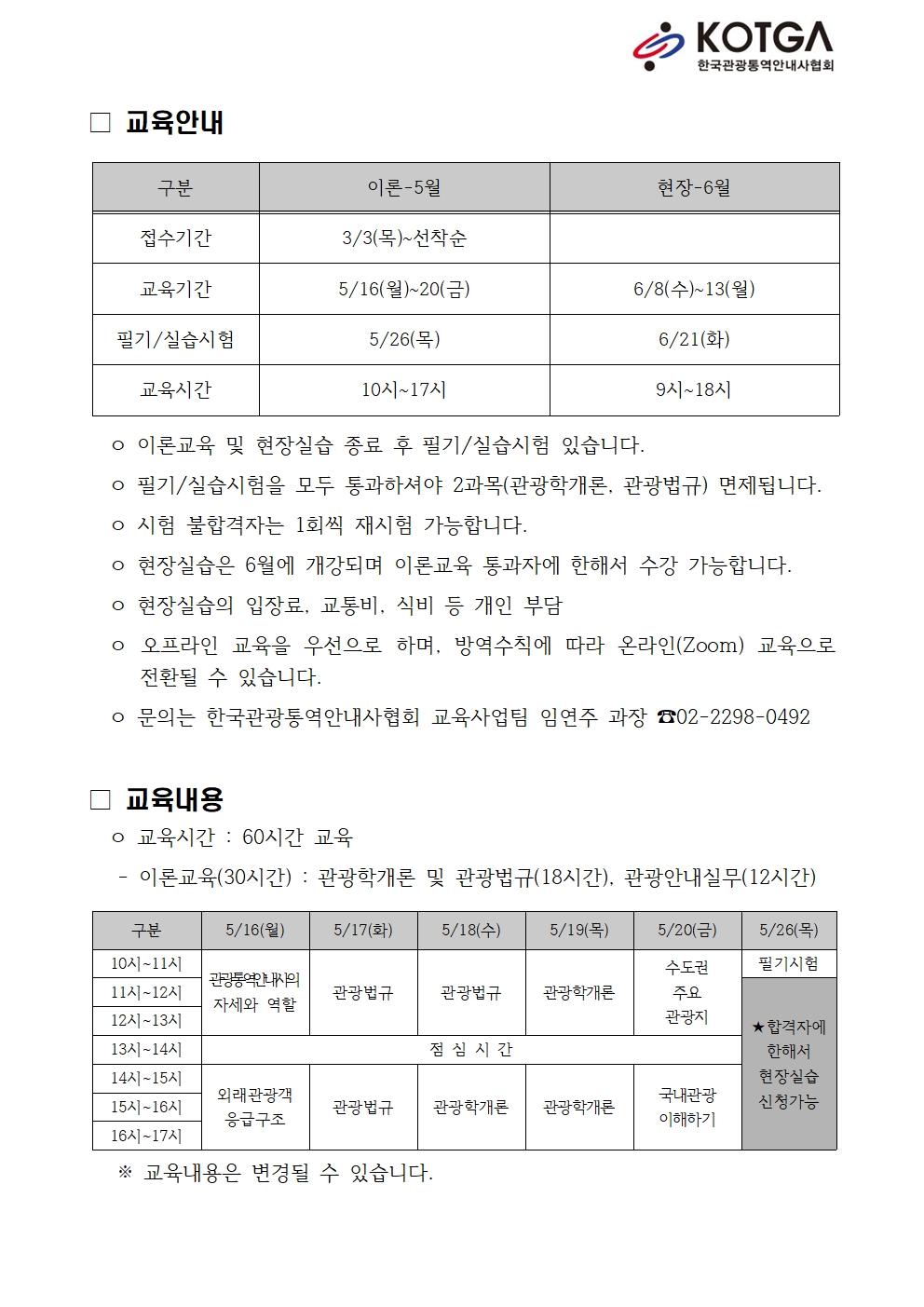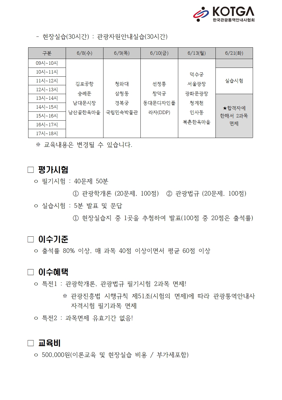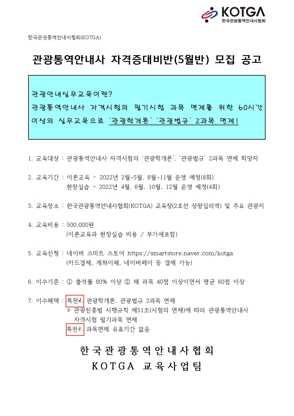 교육명 | 관광통역안내사 자격증 대비반 모집(5월반-필기시험 2과목 면제) |