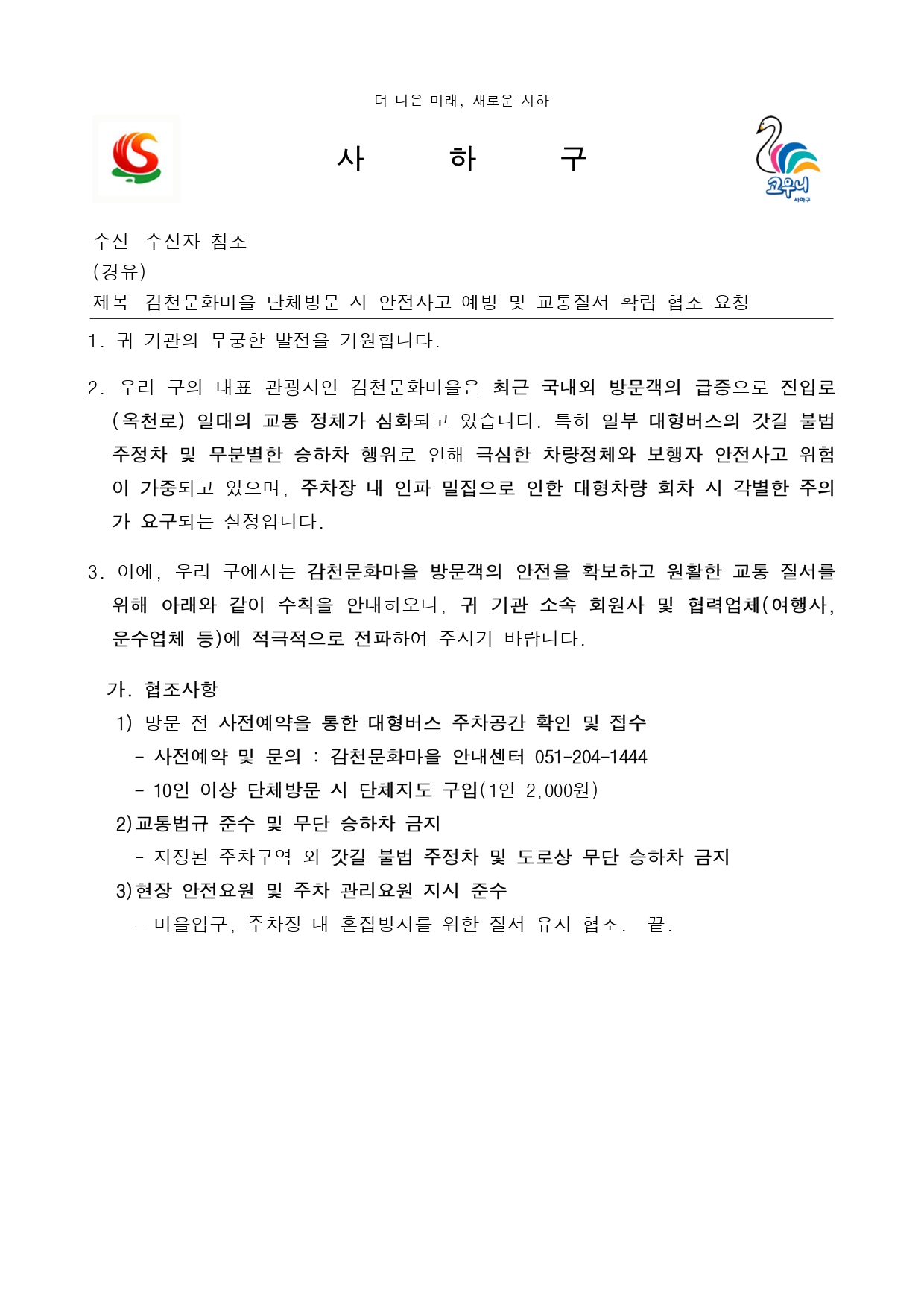 감천문화마을 단체방문 시 안전사고 예방 및 교통질서 확립 협조 요청